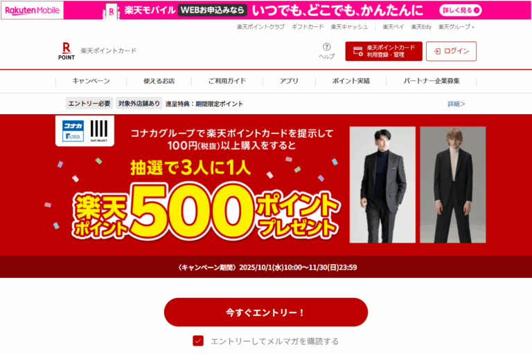 コナカグループ|抽選で3人に1人楽天ポイント500ポイントプレゼント!