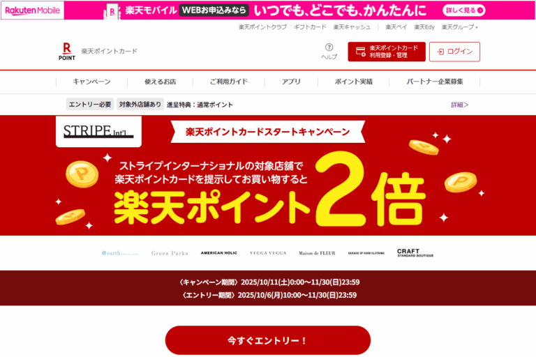 ストライプインターナショナルの対象店舗で楽天ポイントカードを提示してお買い物をすると楽天ポイント2倍