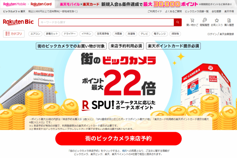 楽天ビック|街のビックカメラでポイント最大22倍!来店予約でSPUステータスに応じたボーナスポイントもらえる!