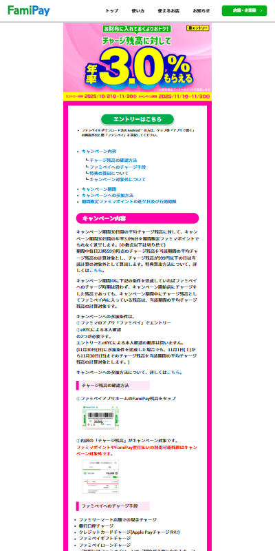 - 2025年11月1日から30日まで、ファミペイのチャージ残高に対して年率3.0%分の期間限定ファミマポイントが還元されるキャンペーンを実施。